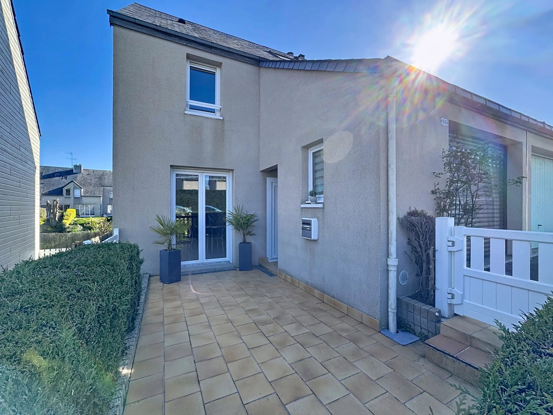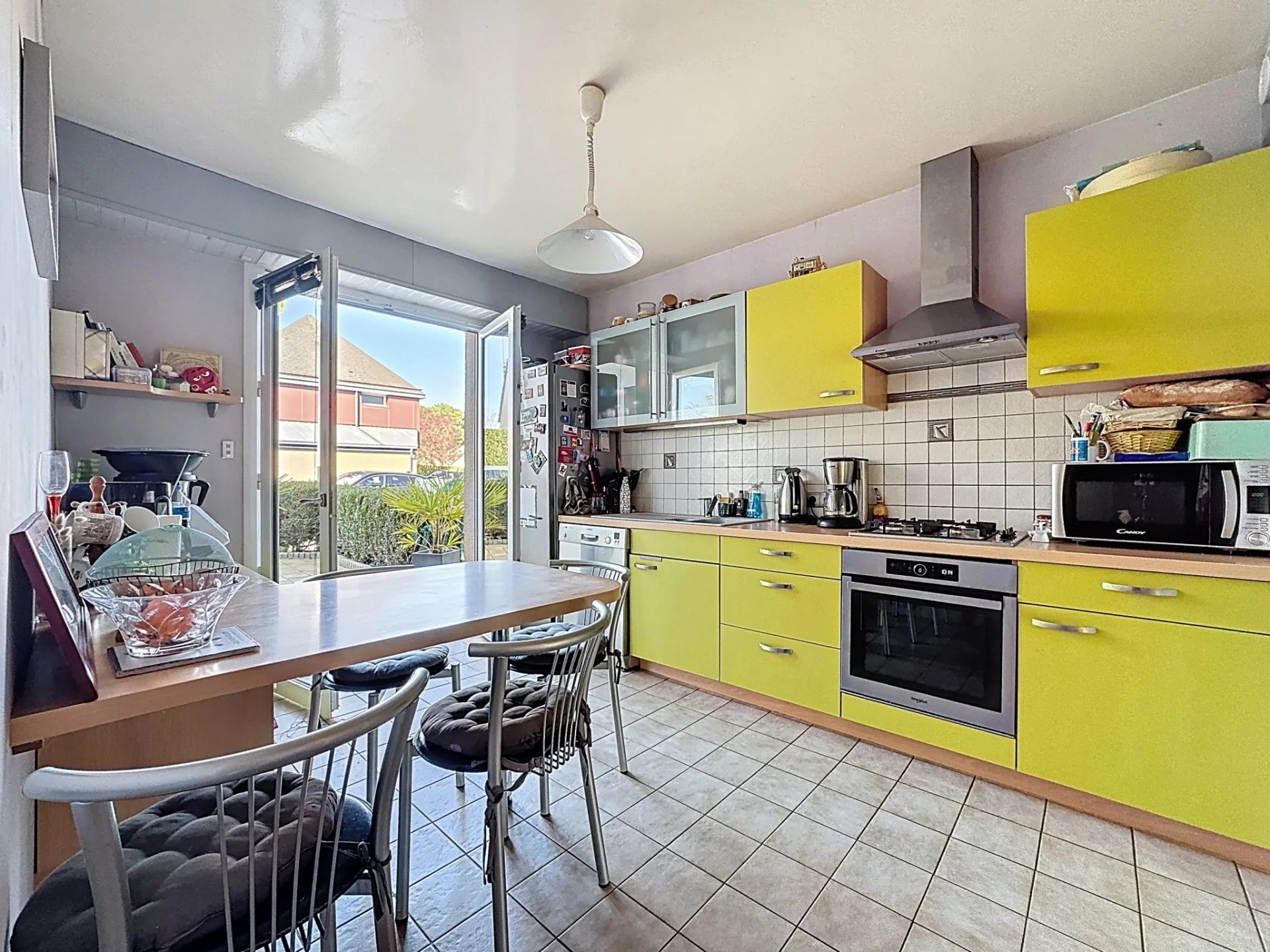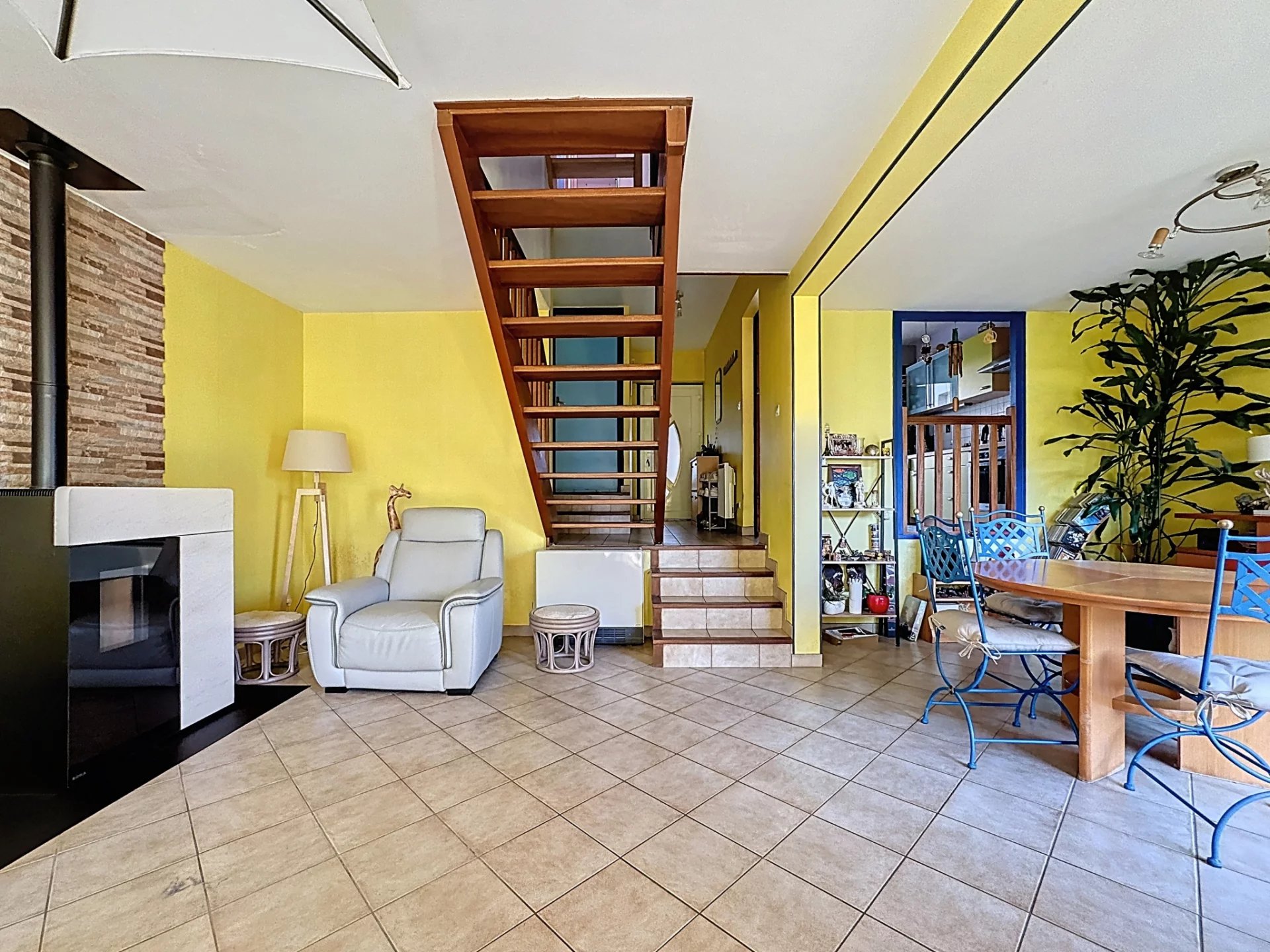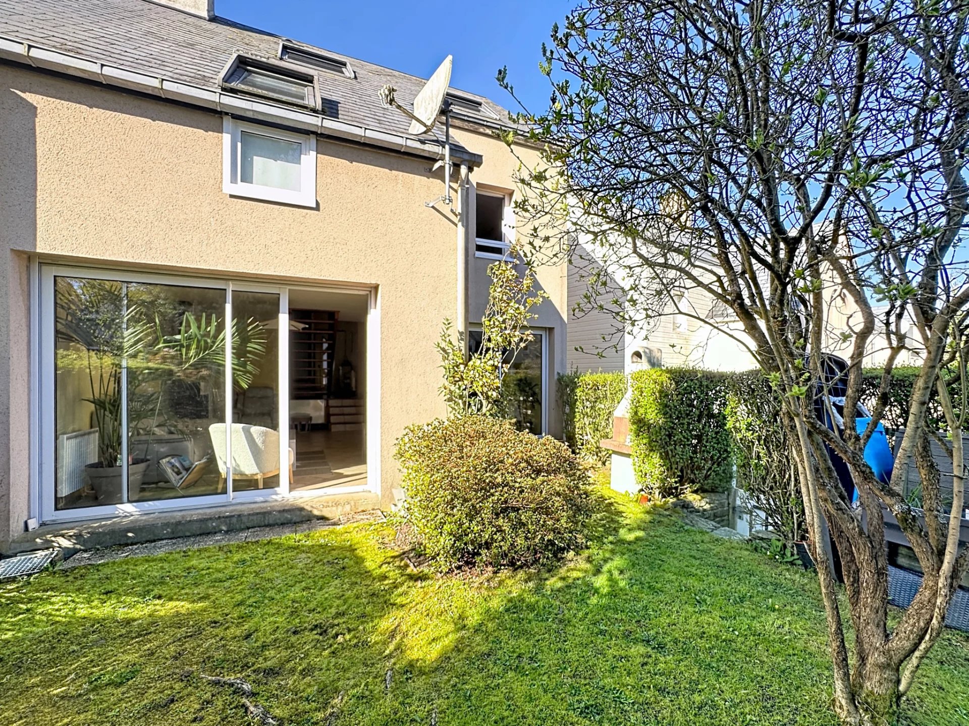 Elle se compose au rez de chaussée d'une cuisine indépendante aménagée et équipée, d'un séjour/ salon avec son poële à granulés donnant sur un jardin à l'abris des regards.