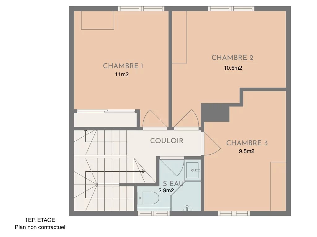 Au 1er étage : 3 chambres entre 9.5 et 11m2, 1 salle d'eau avec WC.